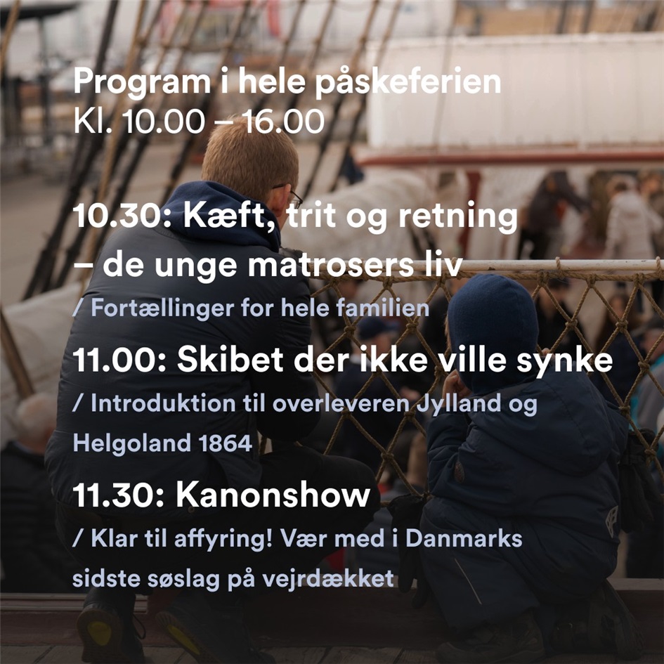 Påskeferien byder på et hav af oplevelser for både store og små. Følg i de unge matrosers fodspor, rør ved fortiden, udforsk skibets imponerende ingeniørkunst, og hold dig for ørerne, når vi affyrer kanonen. Fra kongesalonen til dækkenes trange kår fortæller skibet om besætningens hårde liv og de dramatiske begivenheder i 1800-tallet, der formede Danmark for altid.